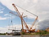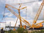 Damit der Kran mit seinen 96 Tonnen Leergewicht und seinen acht Achsen überhaupt ans Weserufer gelangen konnte, musste erst eine eigene Kiesbettung geschüttet werden. Wenn dann noch die Gegengewichte gelastet sind, wiegt das Monstrum ohne Ladung 240 Tonnen. Mit seinem riesigen Ausleger, den die Bediener bis auf 136 Meter ausfahren können, gelingt es, eine Last mit einem Gewicht von bis zu 500 Tonnen anzuheben. mehr