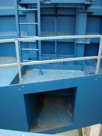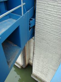 An der Unterseite des Verschlusskörpers befindet sich eine Gummidichtung. Im abgesenkten Zustand drückt die Dichtung auf die betonierte Sohlschwelle im Kanalbett und dichtet das Kanalprofil ab.