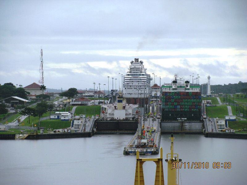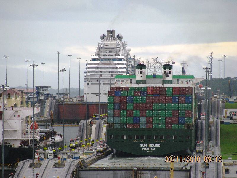 So ausgestattet stellen die Rollschütze künftig die reibungslose Fahrt durch die Schleuse sicher. Ein vom Atlantik kommendes Schiff wird dann im ersten Schritt in die untere Schleusenkammer geschleppt. Ist das äußere Schleusentor geschlossen, fließt das Wasser aus den drei Wasser sparbecken in die Kammer. Parallel dazu wird der Wasserstand der mittleren Schleusenkammer auf das Niveau der unteren abgesenkt. Dann öffnen sich die Tore und Schlepper bringen das Schiff in die mittlere Schleusenkammer. Sind die Tore geschlossen, wiederholt sich derselbe Vorgang aufs Neue: Wasser aus der oberen Kammer und aus den Sparbecken fließt so lange in die mittlere Kammer, bis der Pegel beider Schleusenkammern gleich ist. Die Tore öffnen sich, das Schiff wird in die obere Kammer geschleppt. Sind die Kammern wieder geschlossen, entleeren sich die drei dazugehörigen Wasser sparbecken und der Rest wird durch Frischwasser aus dem Gatúnsee aufgefüllt. Ist die Ausfahrtshöhe erreicht, öffnen sich die äußeren Schleusentore und das Schiff setzt seine Reise Richtung Pazifik fort.