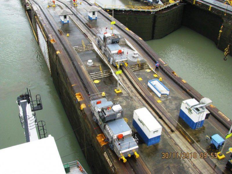 Lokomotiven mit 1000 PS, die von den Einheimischen Mulas (Maulesel) genannt werden, schleppen die riesigen Schiffe in die Schleusen. Damit die Loks sich bei ihrer schweren Last nicht selbst von den Schienen ziehen, wurden sie mit einem eigens konstruierten Zahnrad system ausgerüstet. Dieses greift in ein spezielles drittes Gleis und sorgt so für sicheren Halt. Nur knapp zwei Handbreit Platz bleiben zwischen Bordwand und Kanalwand. Vor 100 Jahren waren die Ausmaße der Schleusenkammern so gigantisch, dass selbst die Titanic den Kanal problemlos hätte durchfahren können. Heute ist das anders. Nahezu jedes Schiff füllt das Schleusenbecken fast vollständig aus. Und genau das macht es so schwierig für Lotsen und Kapitän. Sie müssen in der Schleuse gegen einen hohen Wasserdruck anfahren und trotzdem rechtzeitig stoppen. Im Schnitt kommt es jeden Monat zu ein bis zwei Unfällen.
