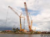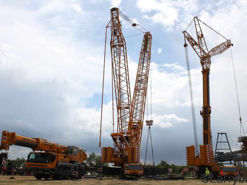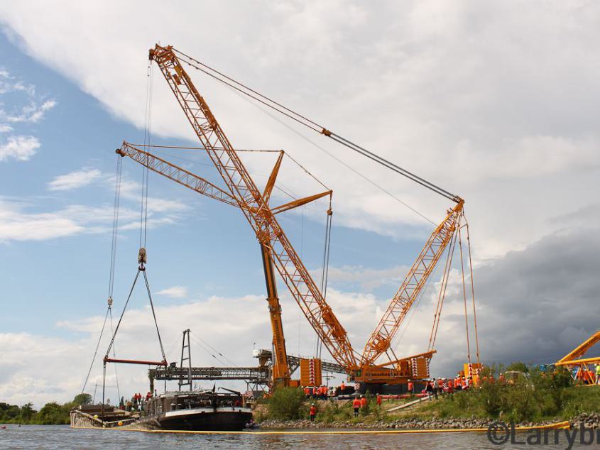 Damit der Kran mit seinen 96 Tonnen Leergewicht und seinen acht Achsen überhaupt ans Weserufer gelangen konnte, musste erst eine eigene Kiesbettung geschüttet werden. Wenn dann noch die Gegengewichte gelastet sind, wiegt das Monstrum ohne Ladung 240 Tonnen. Mit seinem riesigen Ausleger, den die Bediener bis auf 136 Meter ausfahren können, gelingt es, eine Last mit einem Gewicht von bis zu 500 Tonnen anzuheben. mehr