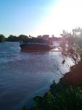 Von Reinhard Bittner 07.05.2011 - Vor rund einer Woche war – wie ausführlich berichtet – das Frachtschiff „Wolfram“ an der Anlegestelle eines Stolzenauer Kieswerkes gesunken. Dabei war der 80 Meter lange Frachter in der Mitte durchgebrochen. Er blockiert seit dieser Zeit die gesamte Kiesproduktion.